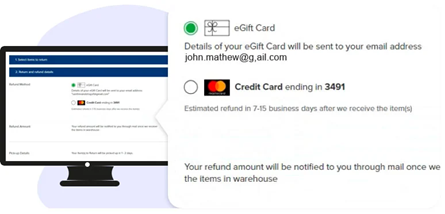 - عندما يطلب المستخدم استرداد الأموال وليس لديه أي بطاقة هدايا إلكترونية مسجلة في معرف البريد الإلكتروني الخاص به، فسنسمح في قسم استرداد الأموال للمستخدم بتحديد بطاقة هدايا إلكترونية جديدة كطريقة لاسترداد الأموال